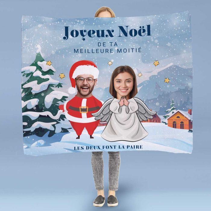 Pour souhaiter un « Joyeux Noël ! » sous une forme peu conventionnelle : petite couverture personnalisée avec photo et visage (ou plutôt : deux visages) et texte. ça c’est un cadeau de Noël sympa et vraiment original qui permet, une fois de plus, d’offrir un cadeau vraiment unique et de faire plaisir. Elle montrera deux visages bien connus de vous ou de vos proches, avec bien entendu en plus les mots que vous avez choisis.
