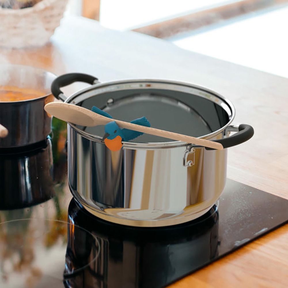 Perché sur le bord de votre casserole, il vous suffit de refermer votre couvercle dessus, et voilà ! La vapeur peut ainsi s'échapper, l'eau reste dans la casserole et la catastrophe du débordement est évitée. Et si votre cuillère a besoin d'une pause ? Confiez-la à ce petit oiseau, elle y restera bien au sec.
